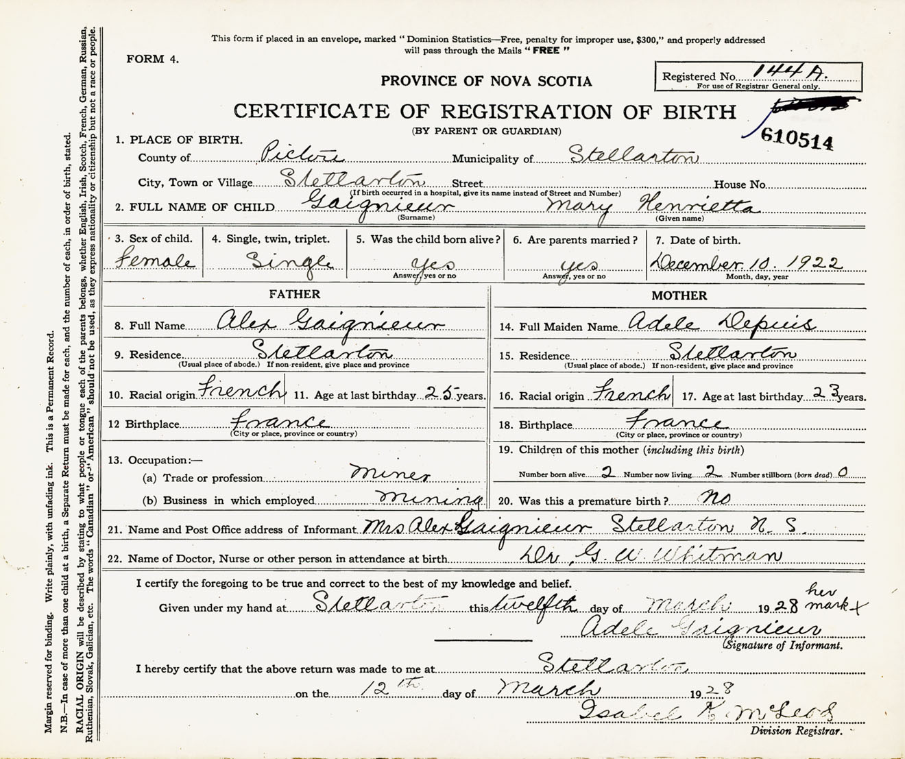 21. Name and Post Office address of Informant Mrs Alex Gaignieur Stellarton