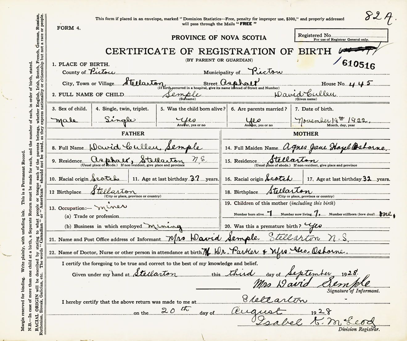 Male Birth Registration: Year: 1922 number: 61000516