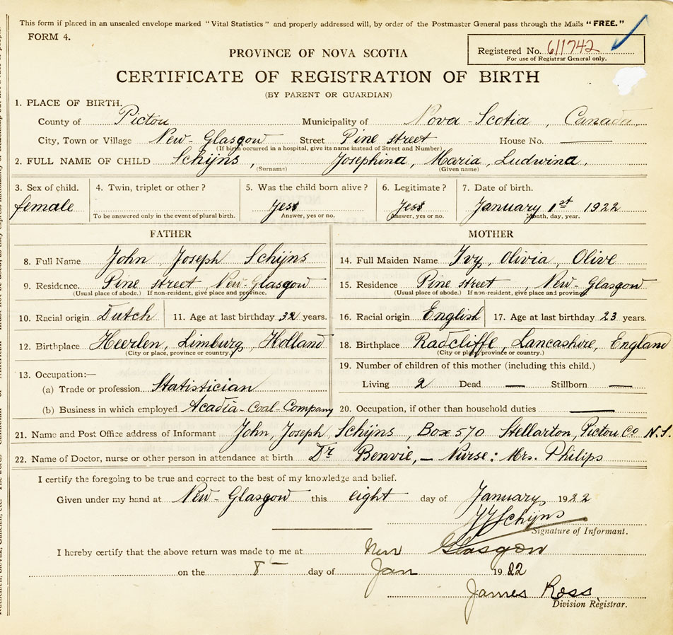 21. Name and Post Office address of Informant John Joseph Schijns Box 570 Stellarton Pictou Co