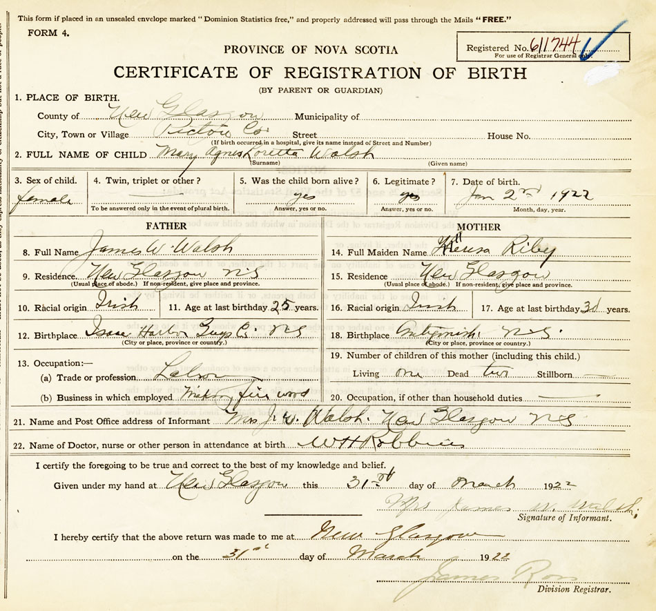 21. Name and Post Office address of Informant Mrs J.W Walsh New Glasgow