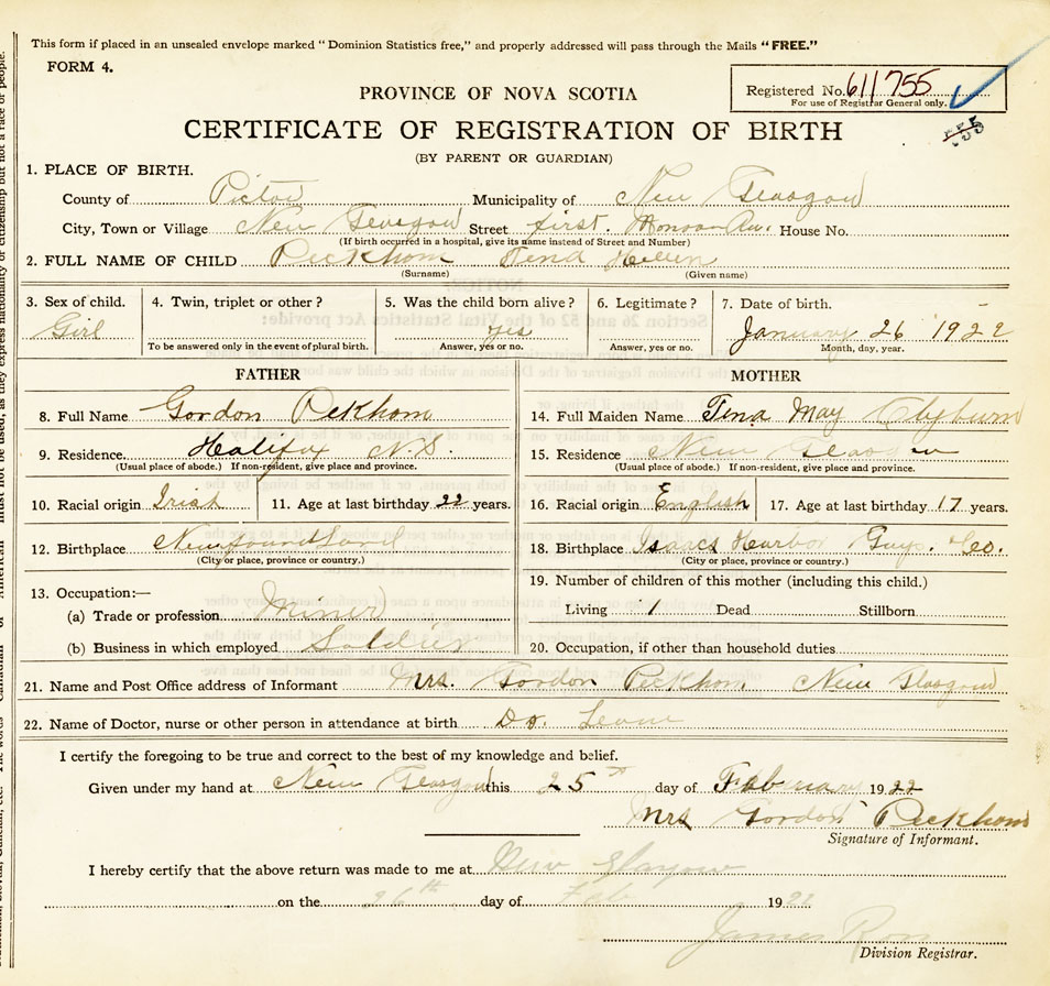 21. Name and Post Office address of Informant Mrs Gordon Peckham New Glasgow