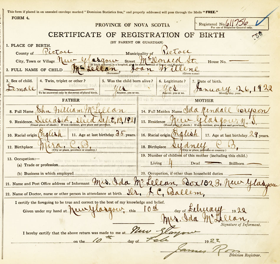 21. Name and Post Office address of Informant Mrs Ida McLellan New Glasgow