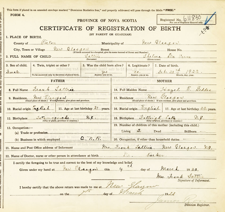21. Name and Post Office address of Informant Mrs. Frank Lattrie New Glasgow N. S.