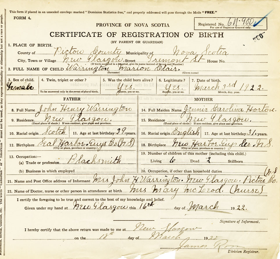 21. Name and Post Office address of Informant Mrs. John H Warrington New Glasgow, Pictou N. S.