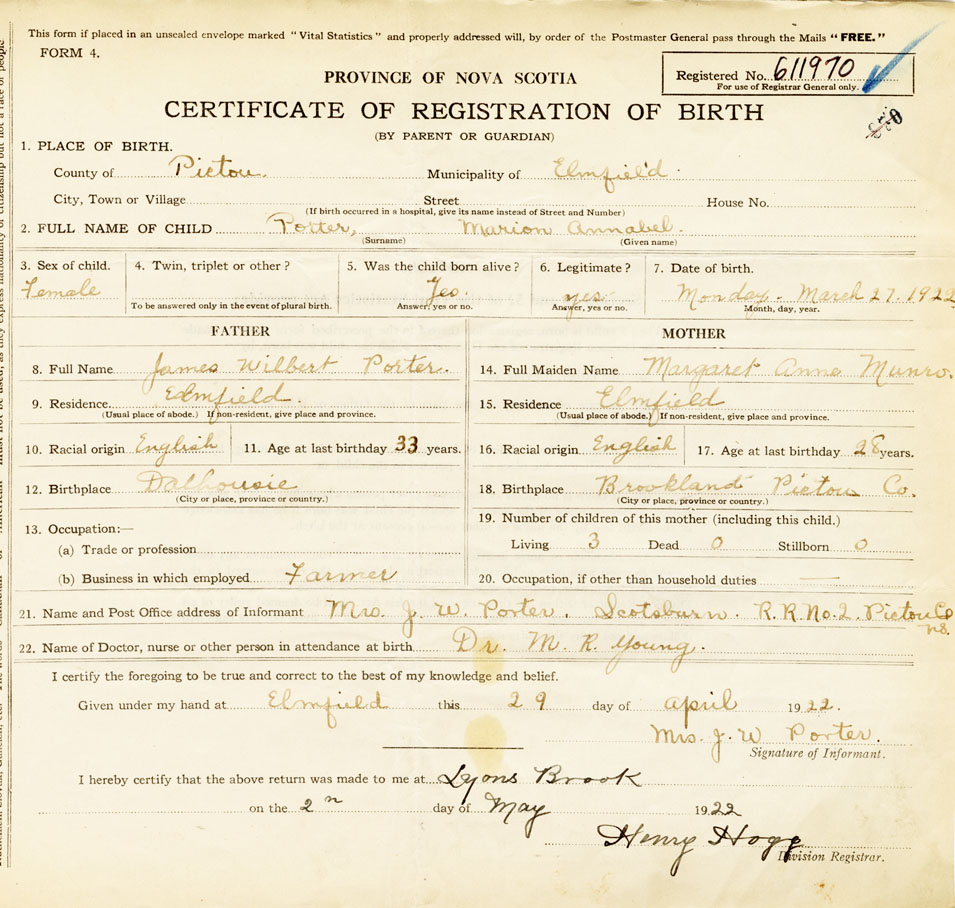 21. Name and Post Office address of Informant Mrs. J. W. Porter Scotsburn R. R. No. @, Pictou N. S.