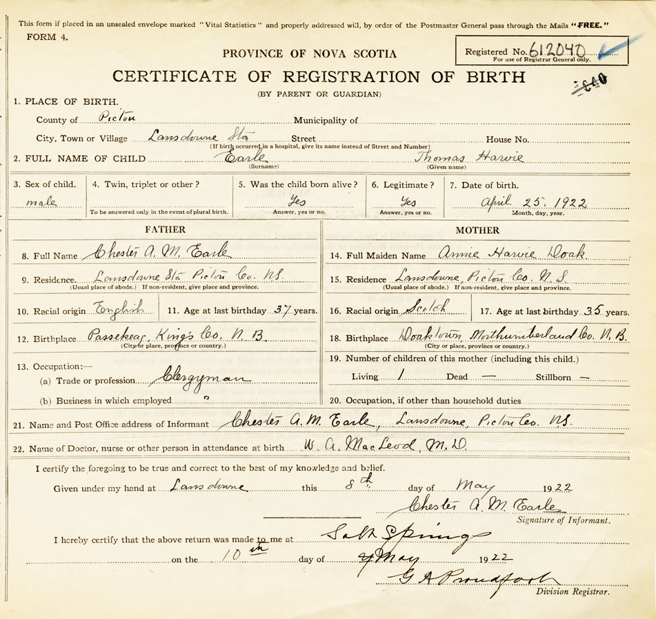21. Name and Post Office address of Informant Chester A. M. Earle Landsdowne, Pictou N. S.