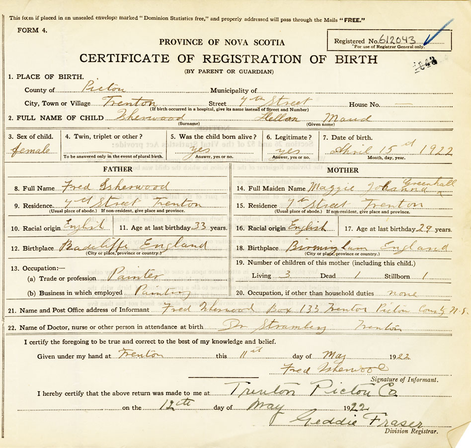 21. Name and Post Office address of Informant Fred Isherwood, Box 133, Trenton, Pictou N. S.