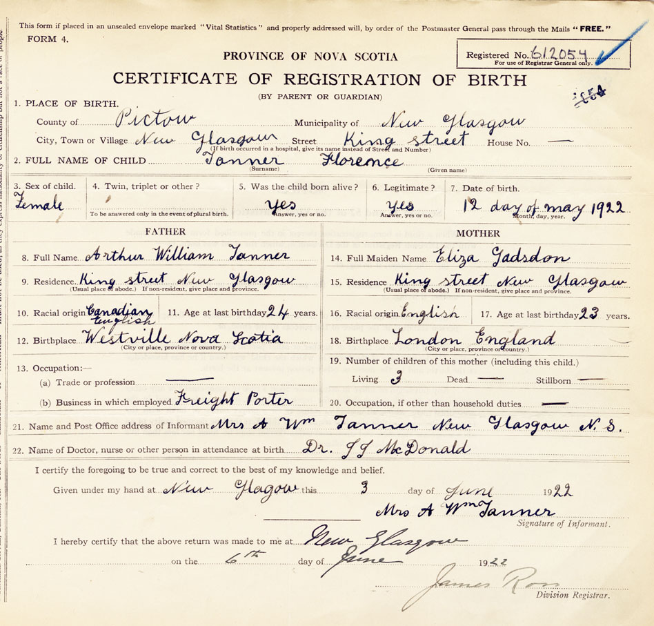 21. Name and Post Office address of Informant Mrs. A. Wm Tanner New Glasgow
