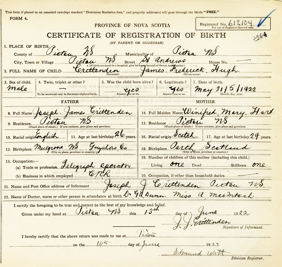 21. Name and Post Office address of Informant Joseph J. Crittenden Pictou N. S.