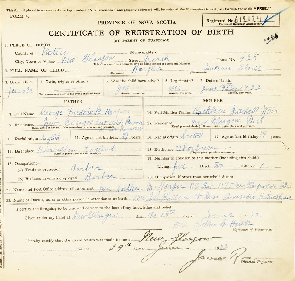 21. Name and Post Office address of Informant Mrs. Kathleen M. Harper P. O. Box 1575 New Glasgow, Pictou N. S.