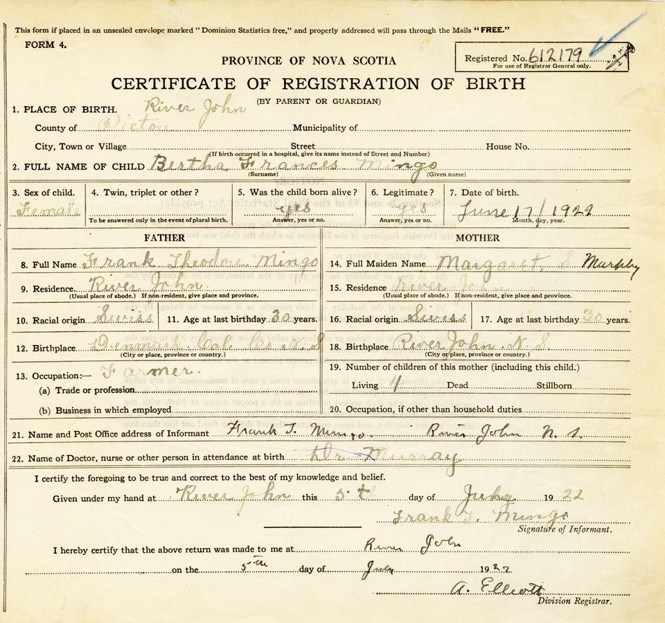 21. Name and Post Office address of Informant Frank Theodore Mingo River John, Nova Scotia