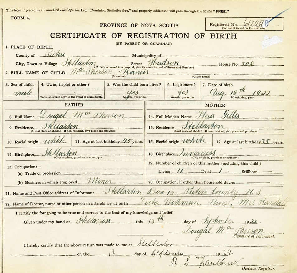 21. Name and Post Office address of Informant Dougal MacPherson Stellarton, Box 12, Pictou County, N. S