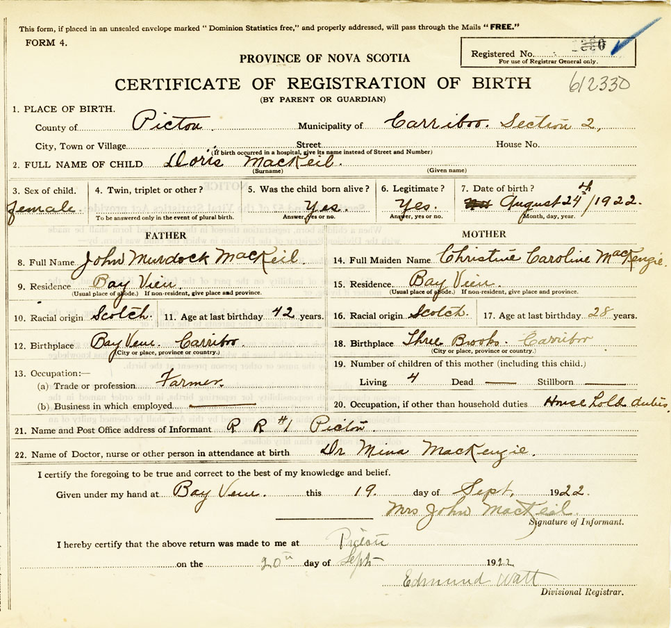 22. Name of Doctor, nurse or other person in attendance at birth Dr. Mina MacKenzie