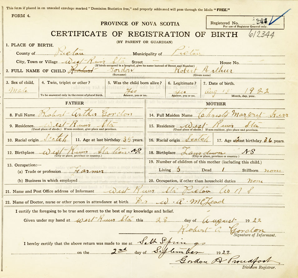 21. Name and Post Office address of Informant Robert A Gordon West River Sta. Pictou N. S.