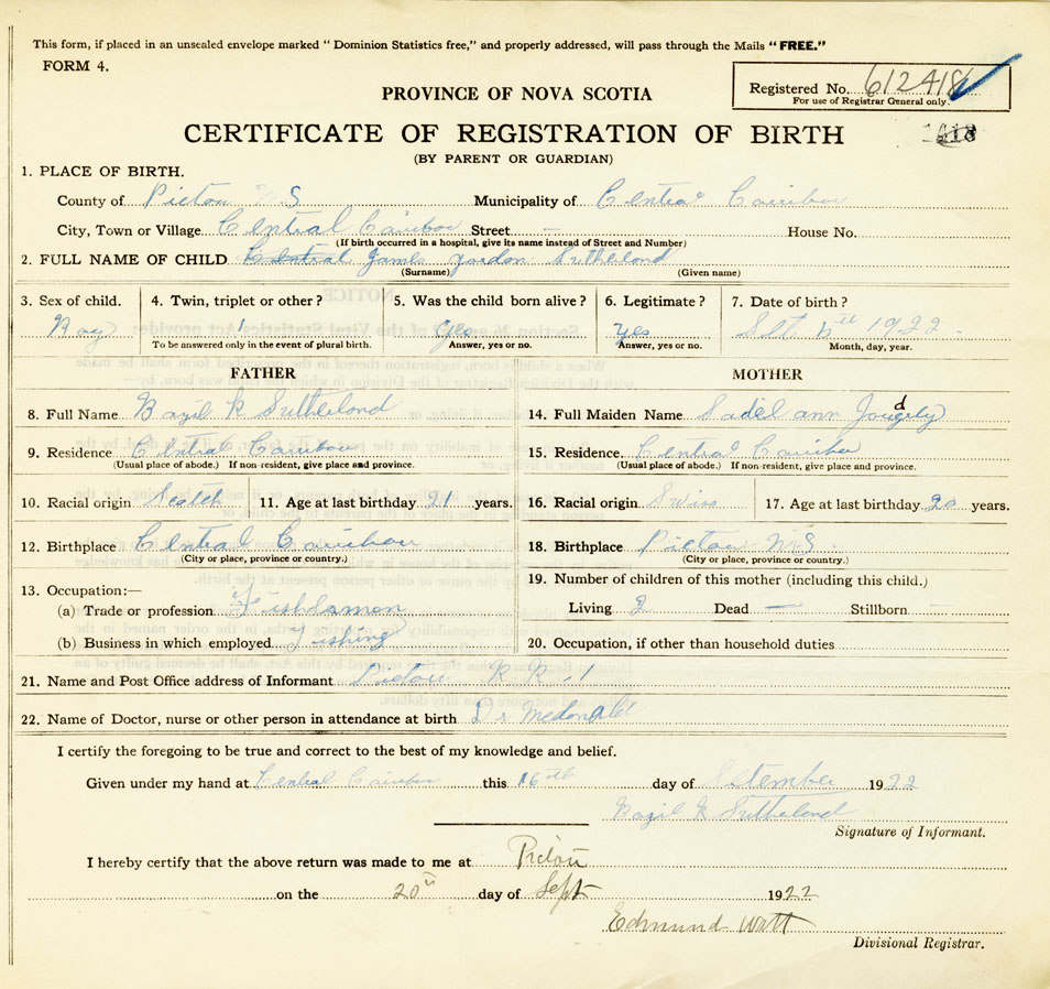 21. Name and Post Office address of Informant Basil Sutherland Pictou