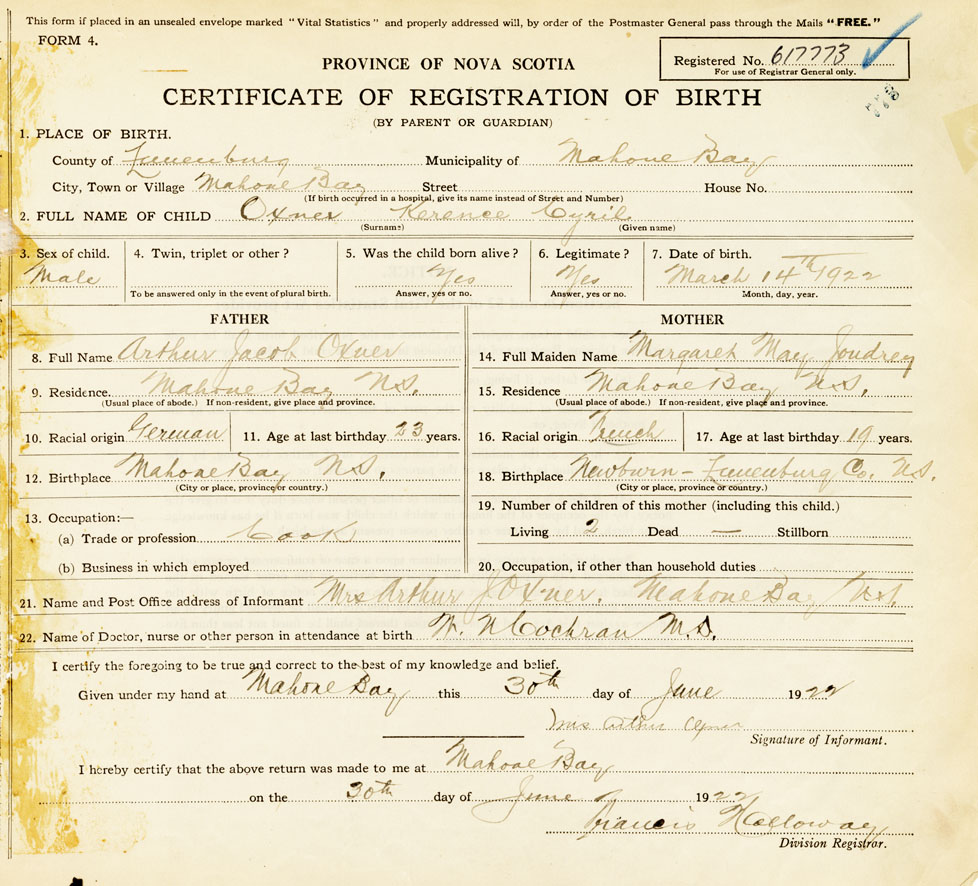 21. Name and Post Office address of Informant Mrs Arthur Oxner Mahone Bay