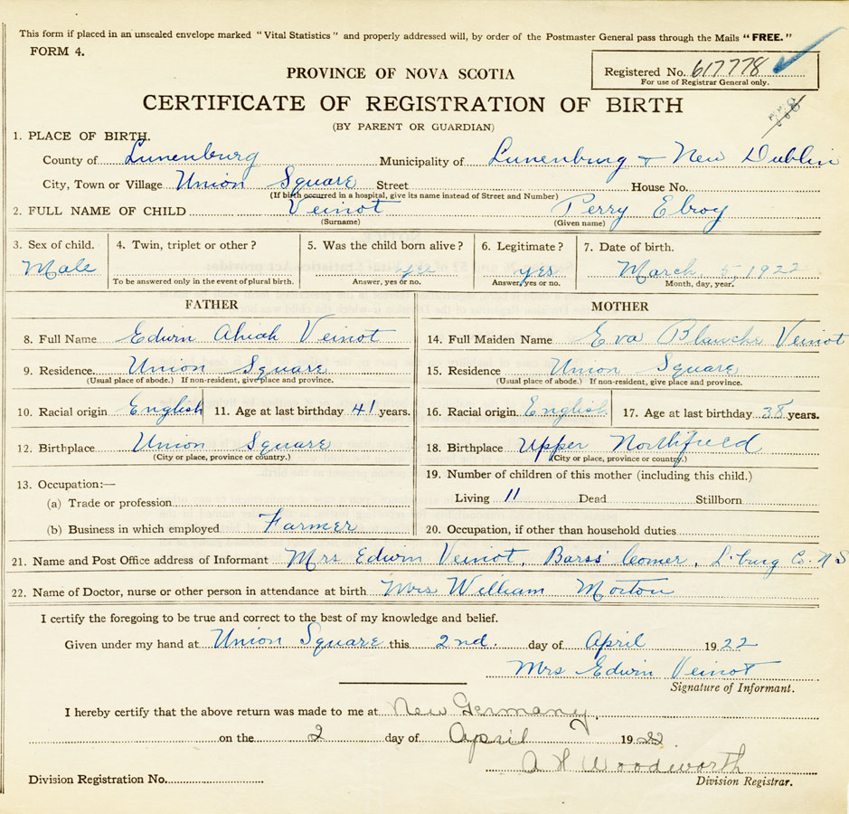 21. Name and Post Office address of Informant Mrs Edwin Veinot Barss Corner, Lunenburg County,