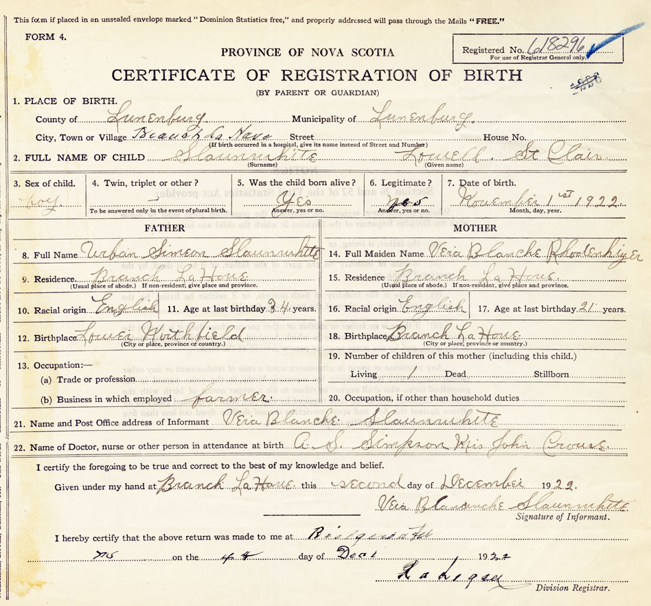21. Name and Post Office address of Informant Vera Blance Slauenwhite Branch LaHave