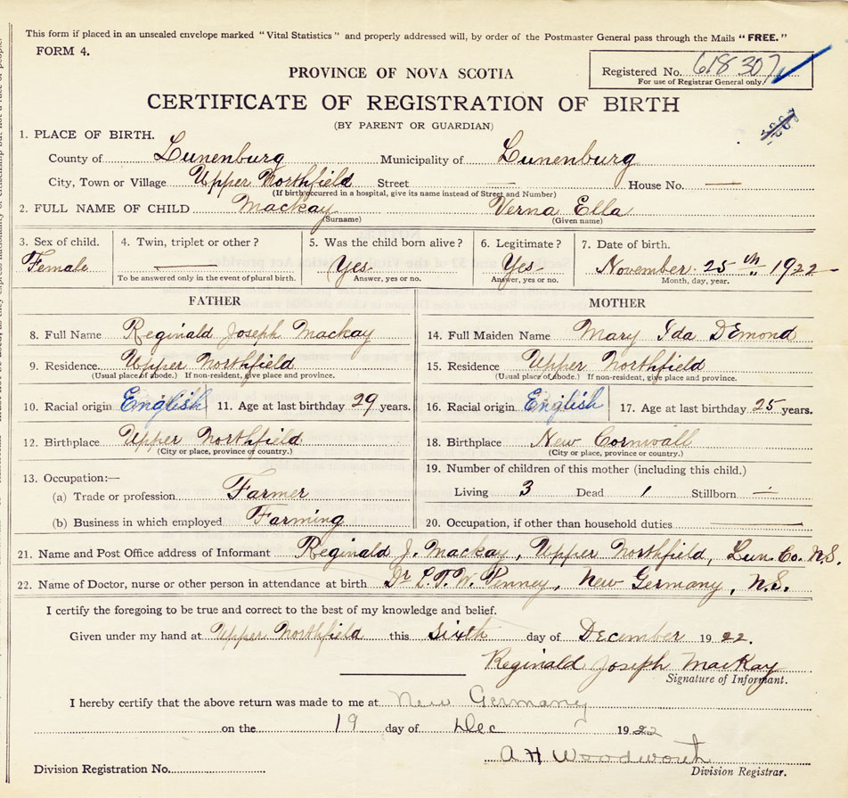 21. Name and Post Office address of Informant Reginald J. Mackay Upper Northfield, Lun.Co. N. S.