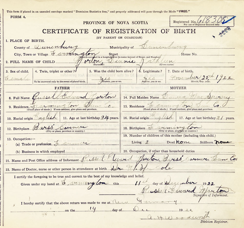 21. Name and Post Office address of Informant Russell Edward Morton Barss Corner, Lun.Co.