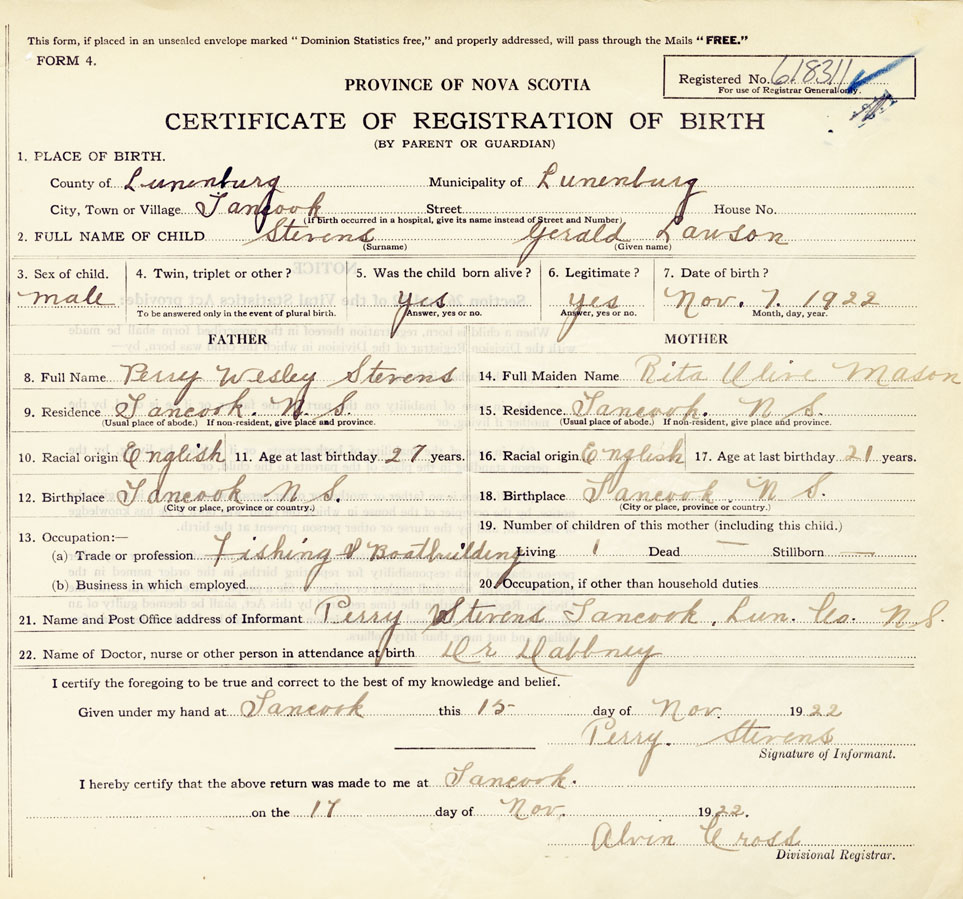 21. Name and Post Office address of Informant Perry Stevens Tancook, Lun.Co.
