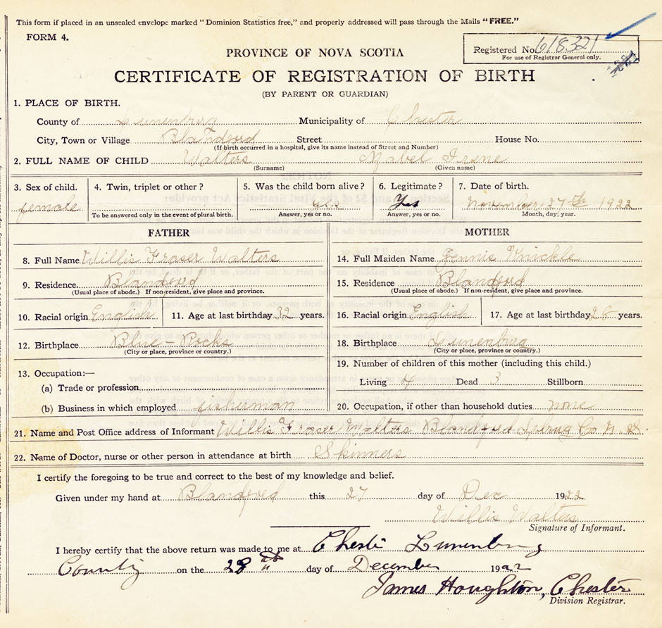 21. Name and Post Office address of Informant Willis Fraser Willis Blandford, Lunenburg N.S.