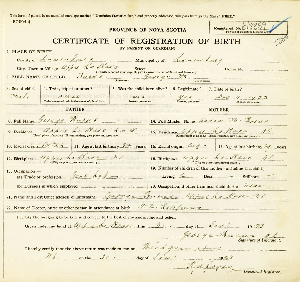 21. Name and Post Office address of Informant George Burns Upper La Have