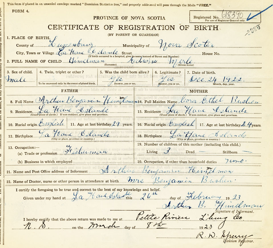 21. Name and Post Office address of Informant Arthur Benjamin Himmelman La Have Islands