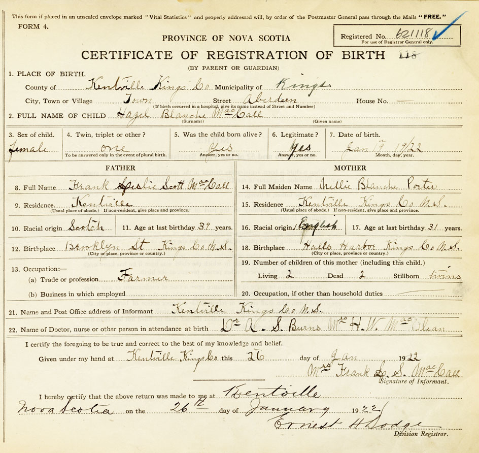 21. Name and Post Office address of Informant Mrs. Frank L. S. MacCall Kentville, Kings N.S.