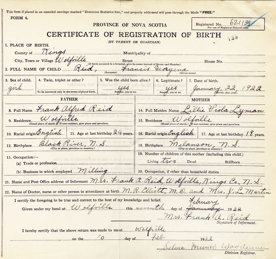 21. Name and Post Office address of Informant Mrs. Frank A. Reid Wolfville, Kings County