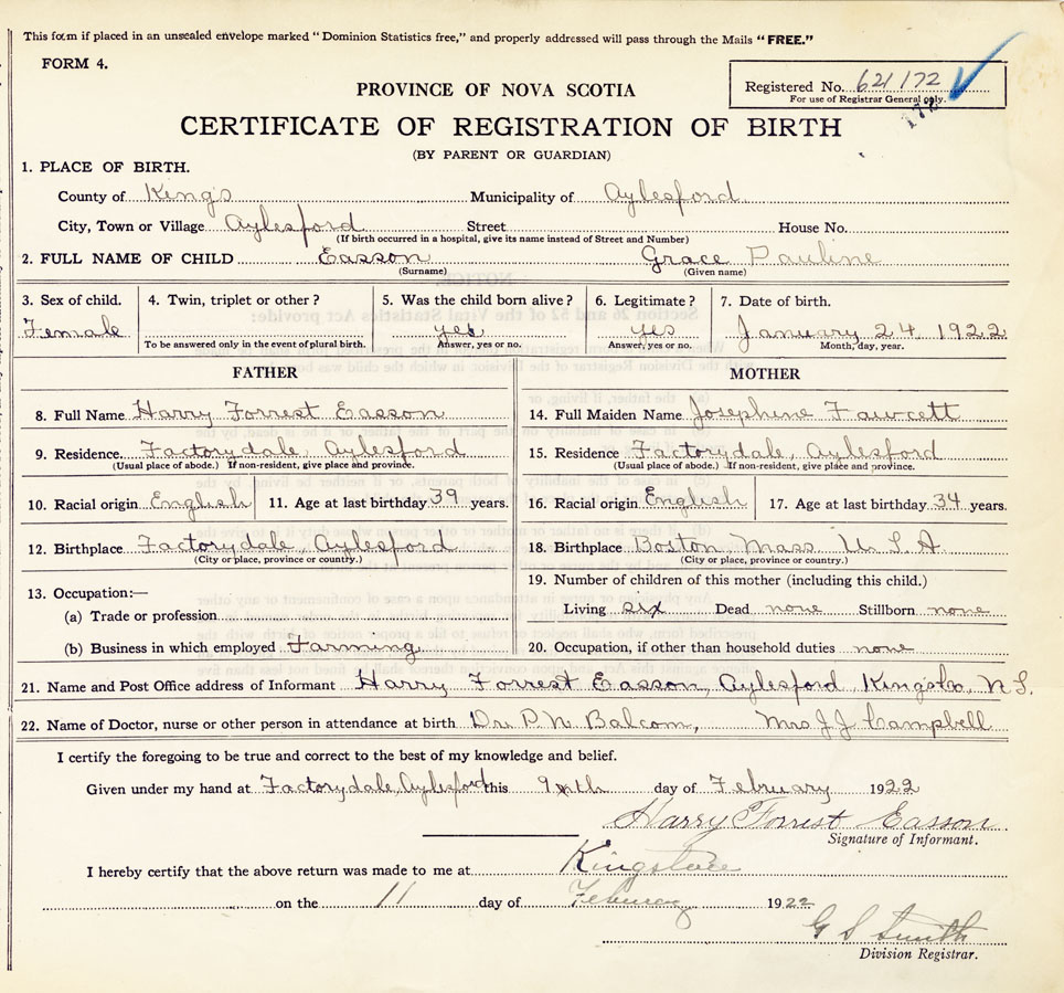 21. Name and Post Office address of Informant Harry Forrest Easson Aylesford, Kings