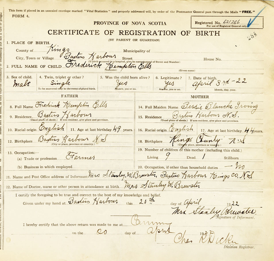 21. Name and Post Office address of Informant Mrs. Stanley W. Brewster Baxters Harbour, Kings N.S.