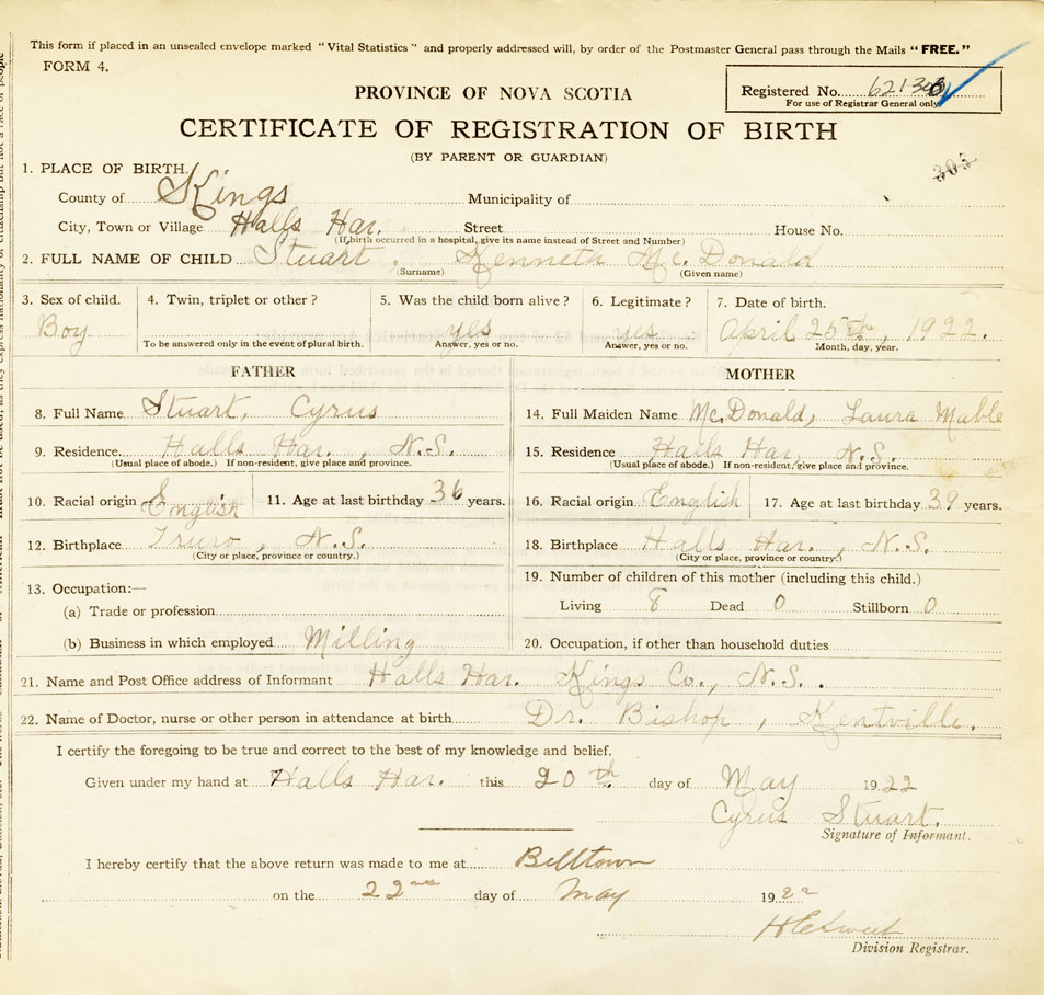 22. Name of Doctor, nurse or other person in attendance at birth Dr. Bishop, Kentville