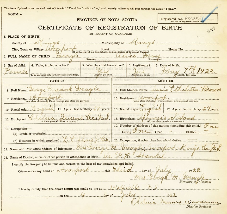 21. Name and Post Office address of Informant Mrs. George M. Weagle Avonport, Kings zoo.