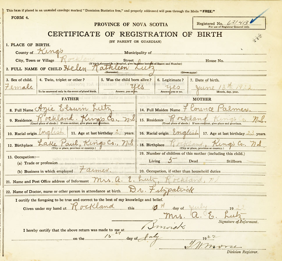 21. Name and Post Office address of Informant Mrs. A. E. Lutz Rockland, N.S.