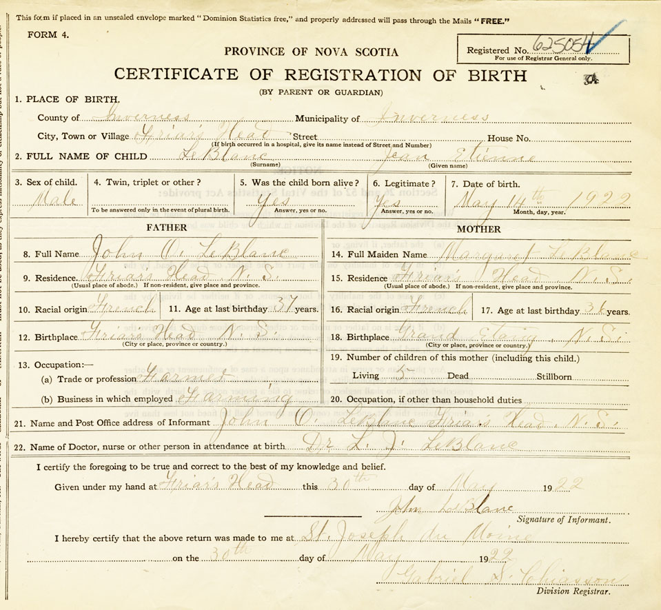 22. Name of Doctor, nurse or other person in attendance at birth Dr. L J LeBlanc
