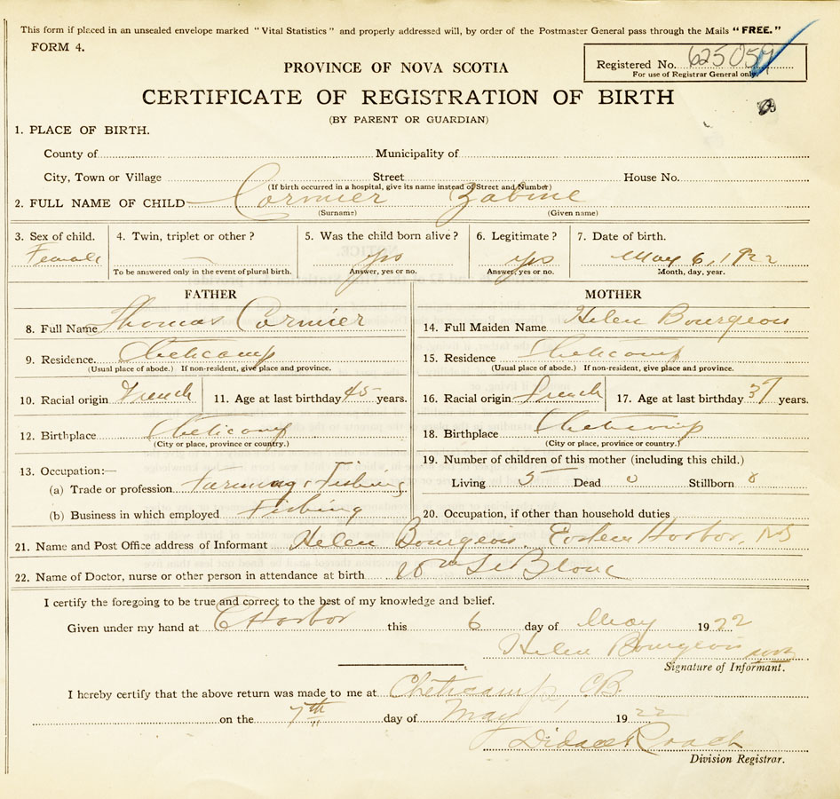 21. Name and Post Office address of Informant Helen Bourgeois Eastern Harbor