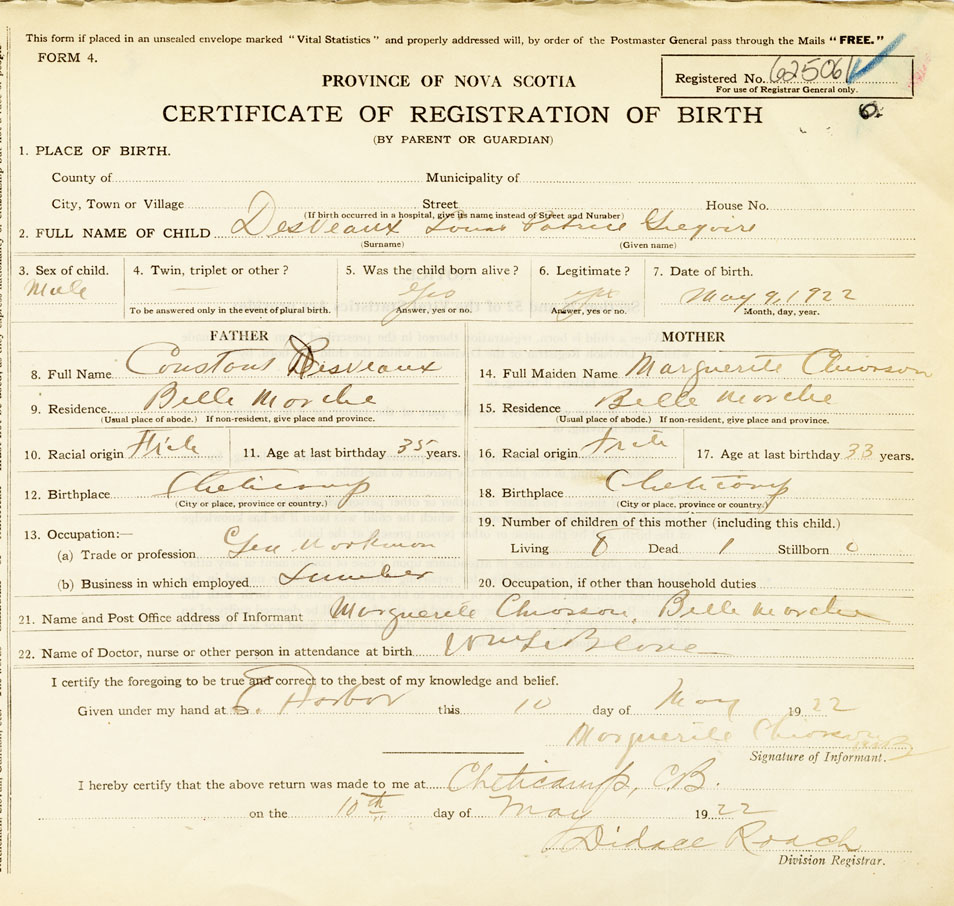 21. Name and Post Office address of Informant Marguerite Chiasson Belle Marche