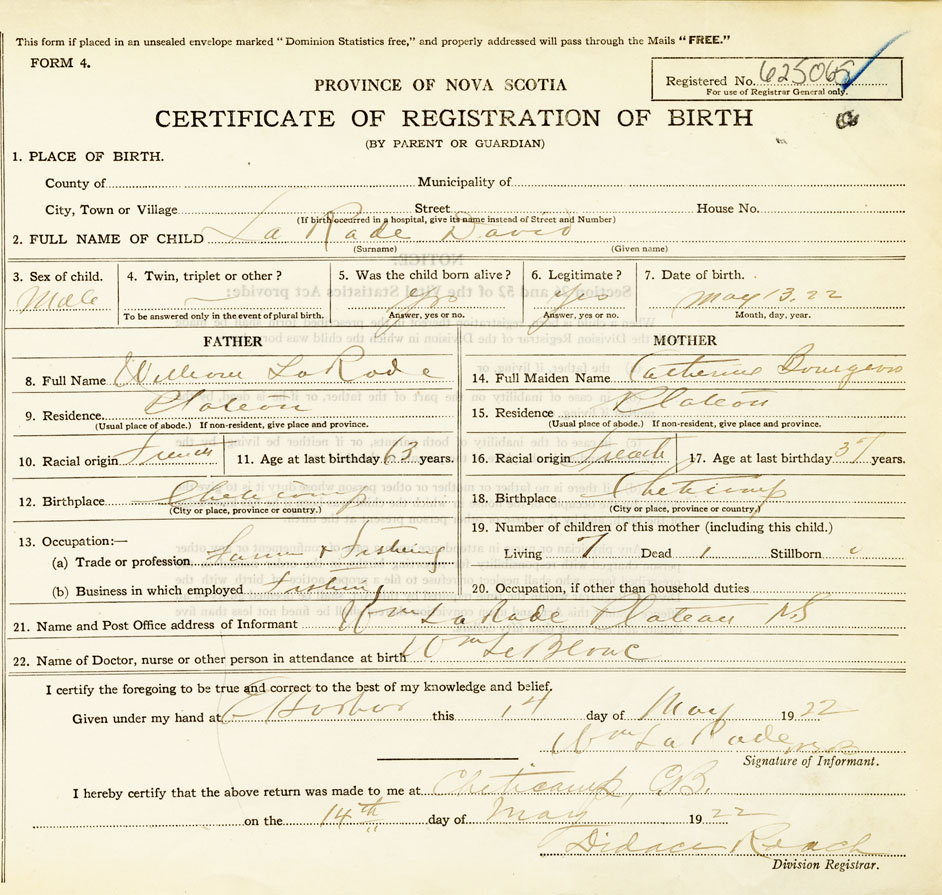 22. Name of Doctor, nurse or other person in attendance at birth Wm. LeBlanc