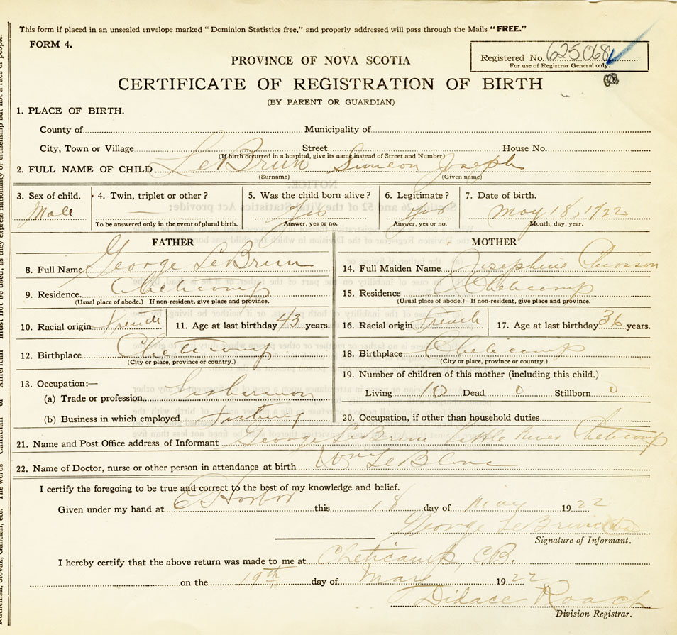 22. Name of Doctor, nurse or other person in attendance at birth Wm. LeBlanc