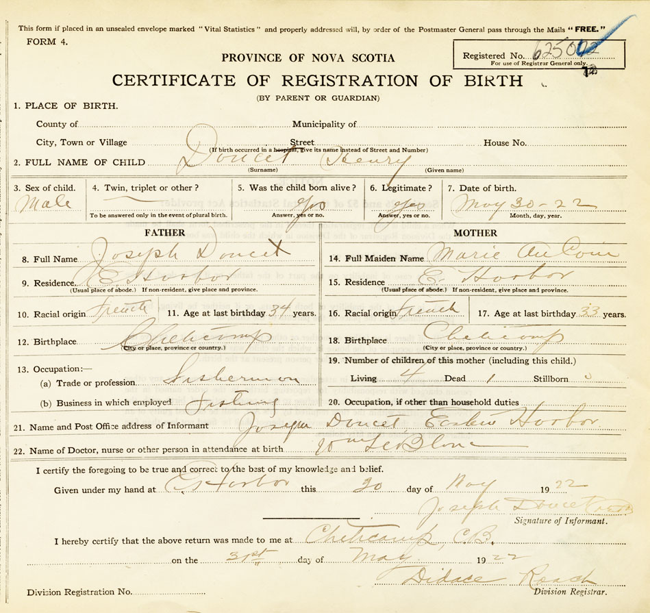 21. Name and Post Office address of Informant Joseph Doucet Eastern Harbor