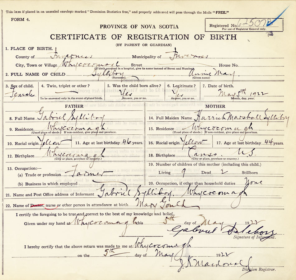 21. Name and Post Office address of Informant Gabriel Sylliboy Whycocomagh