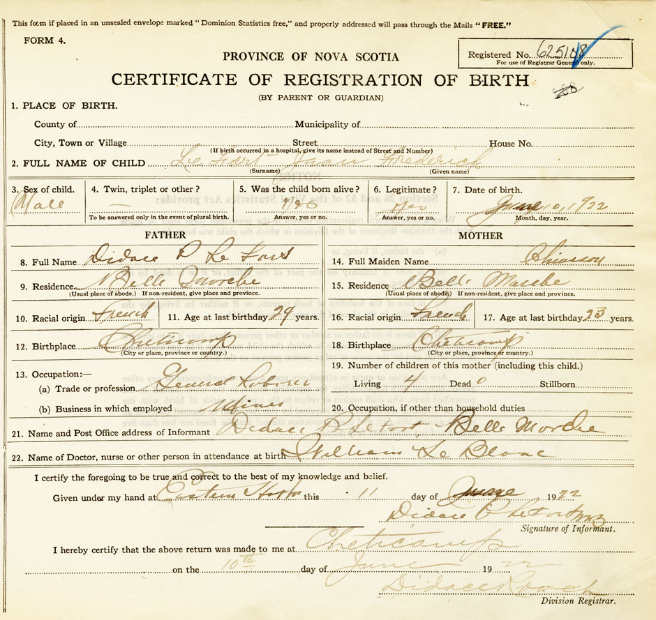 22. Name of Doctor, nurse or other person in attendance at birth William LeBlanc