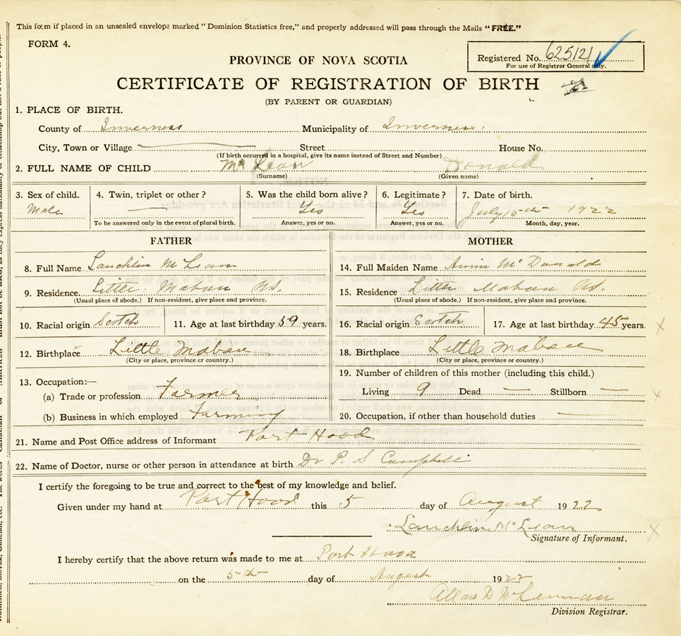 21. Name and Post Office address of Informant Lauchlin McLean Port Hood