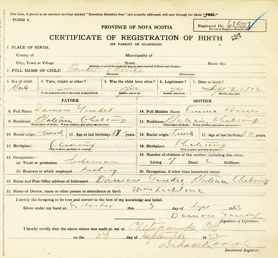 21. Name and Post Office address of Informant Damase Gaudet Plateau, Cheticamp