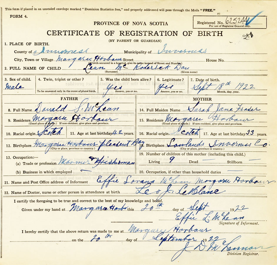 21. Name and Post Office address of Informant Effie Lorina McLean Margaree Harbour