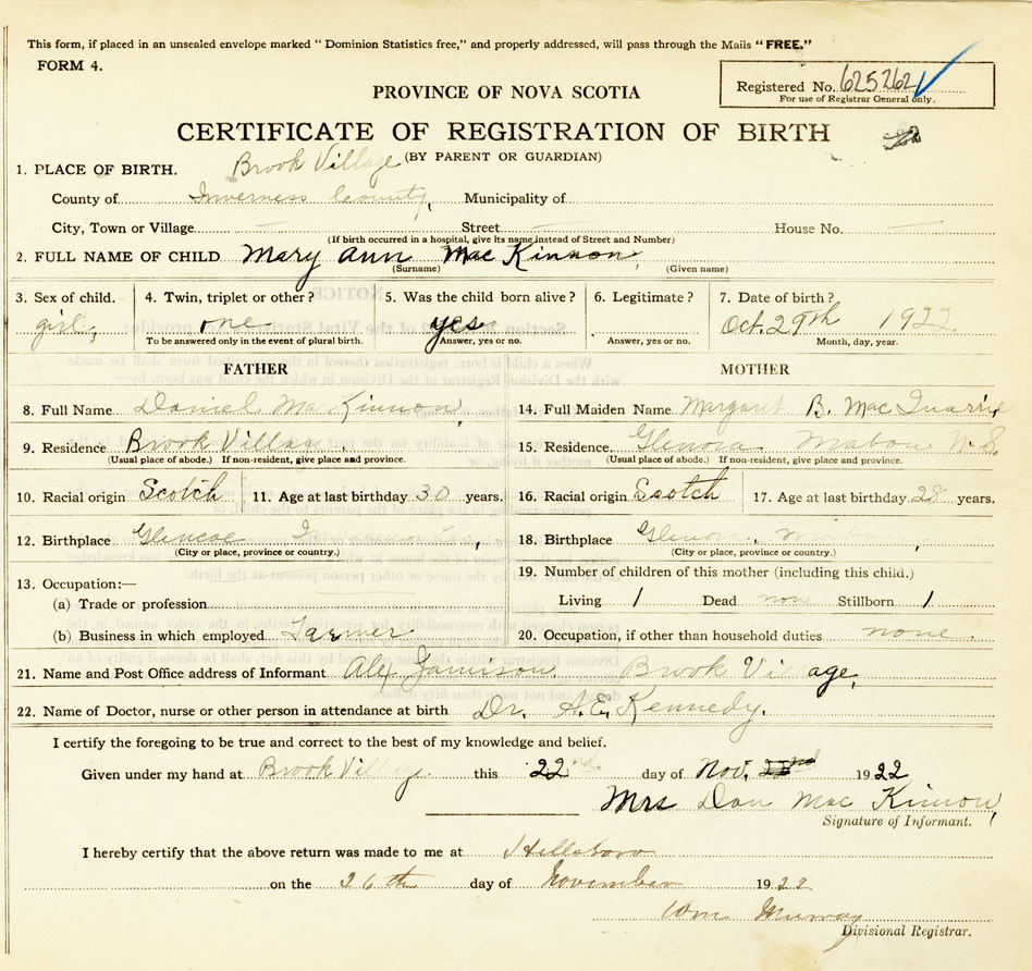 21. Name and Post Office address of Informant Mrs Dan MacKinnon Brook Village