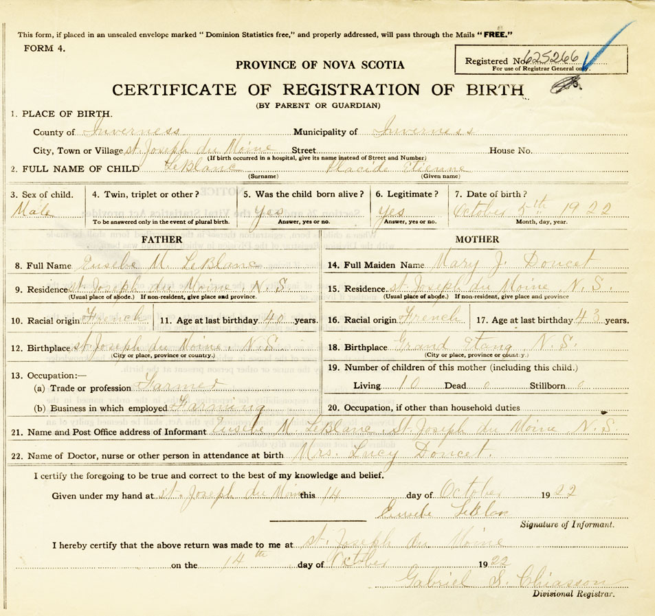 21. Name and Post Office address of Informant Eusebe M LeBlanc St Joseph du Moine