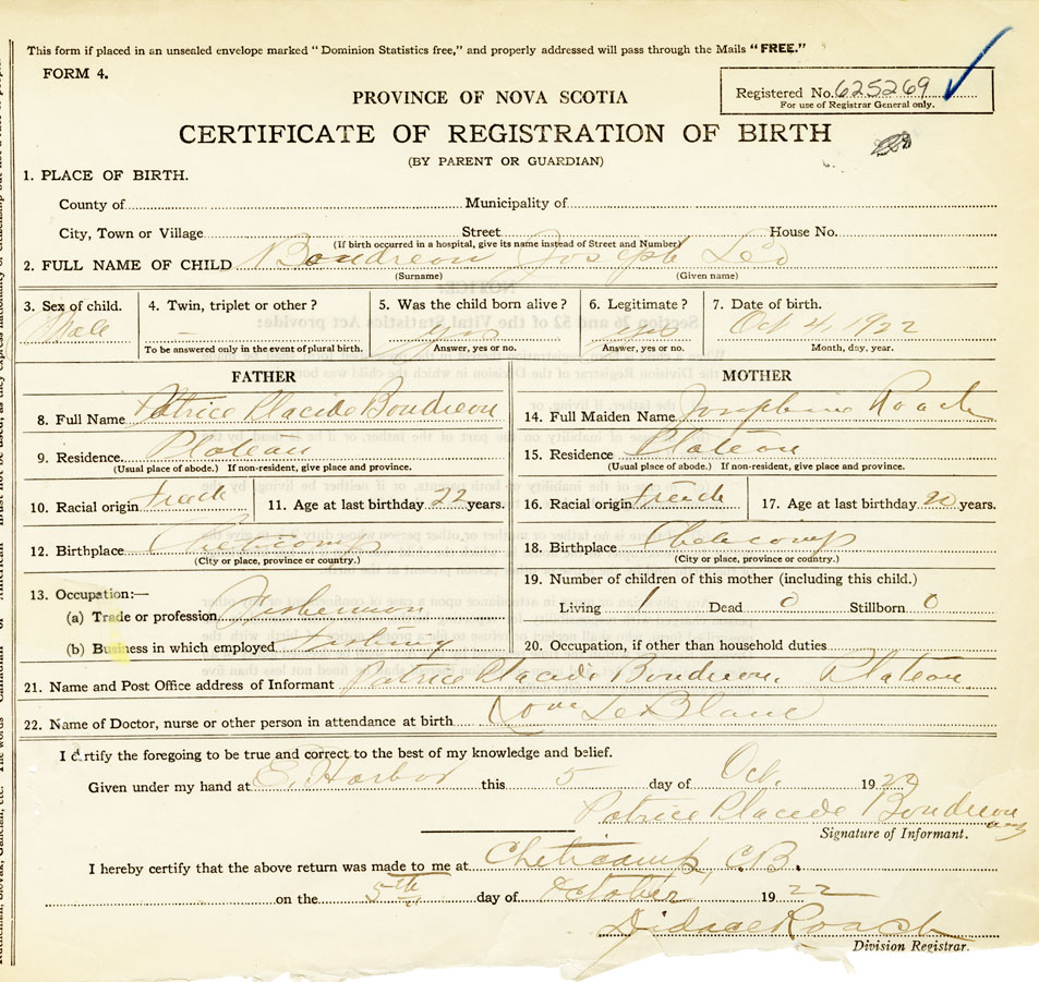 22. Name of Doctor, nurse or other person in attendance at birth Wm. LeBlanc