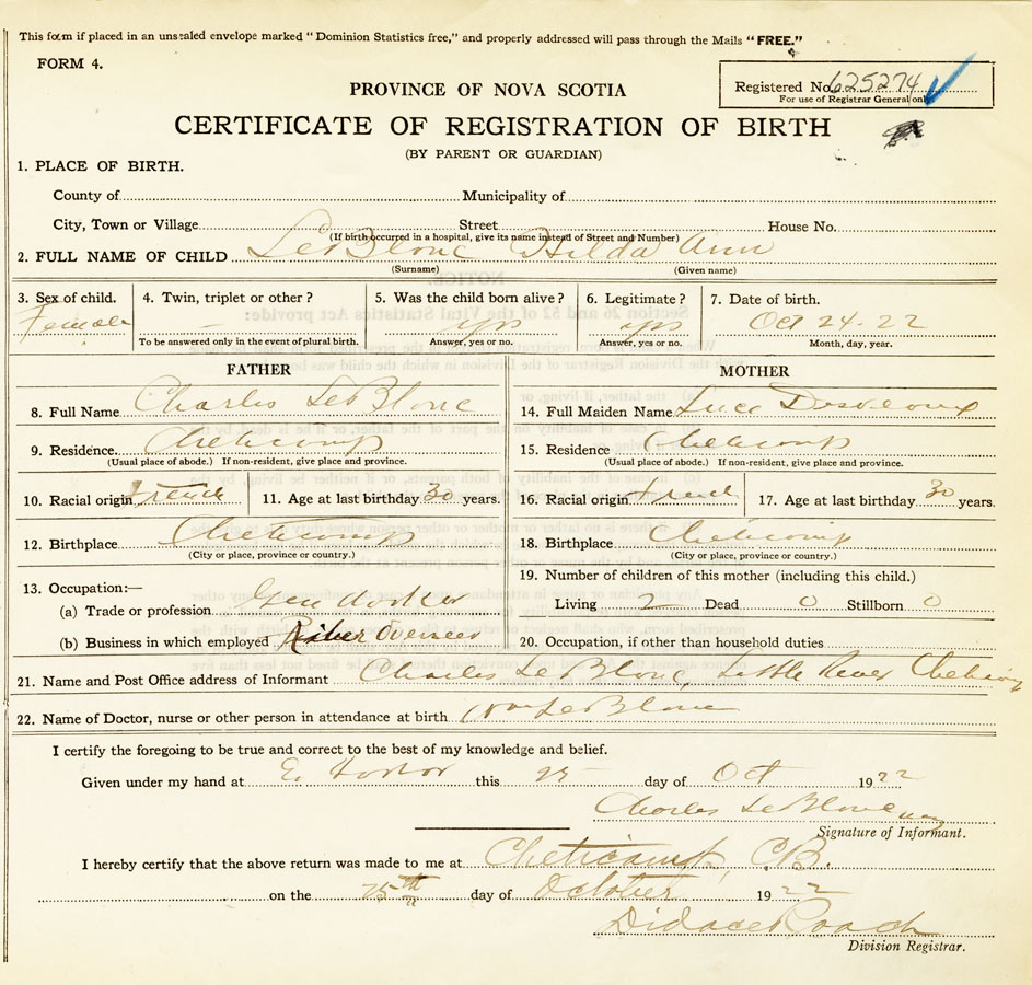 21. Name and Post Office address of Informant Charles LeBlanc Little River, Cheticamp